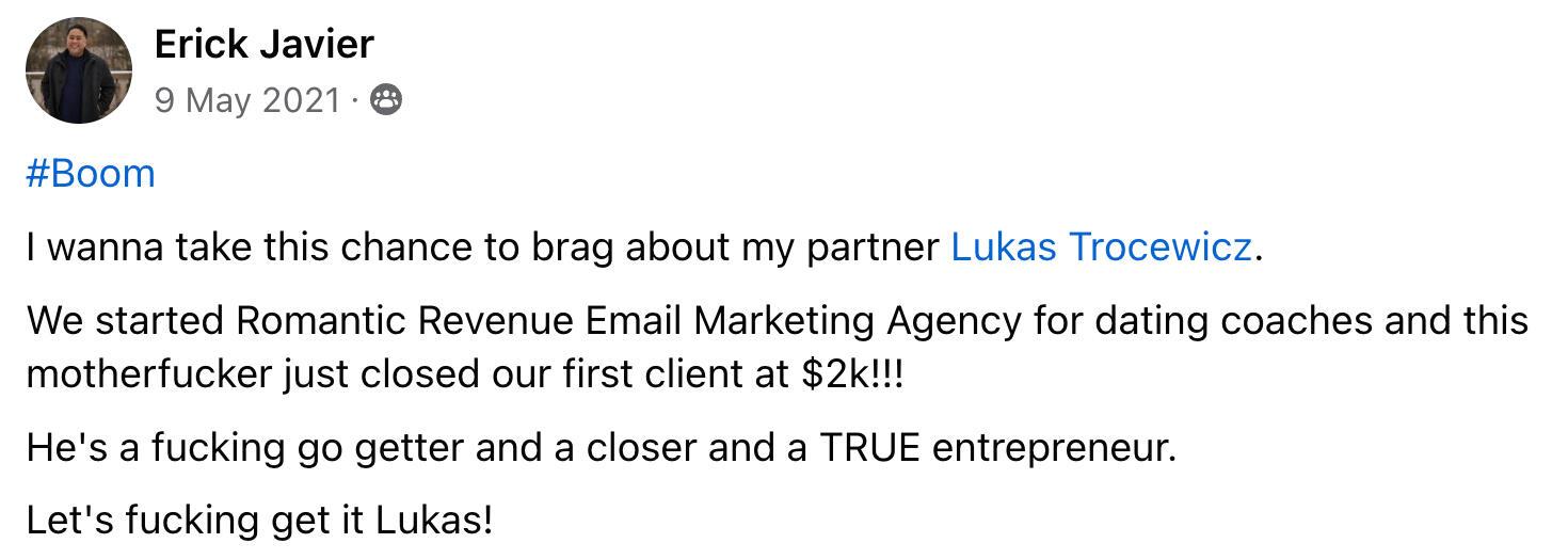 I've worked with the biggest companies and creators in the world like Uber, Indeed, Tanner Shuck, Sean Ferres and Josef Rakich.I've consulted over 500+ freelancers showing them exactly how to land high ticket clients and work from anywhere in the world.I’m here to teach you exactly how to achieve the same success – step by step